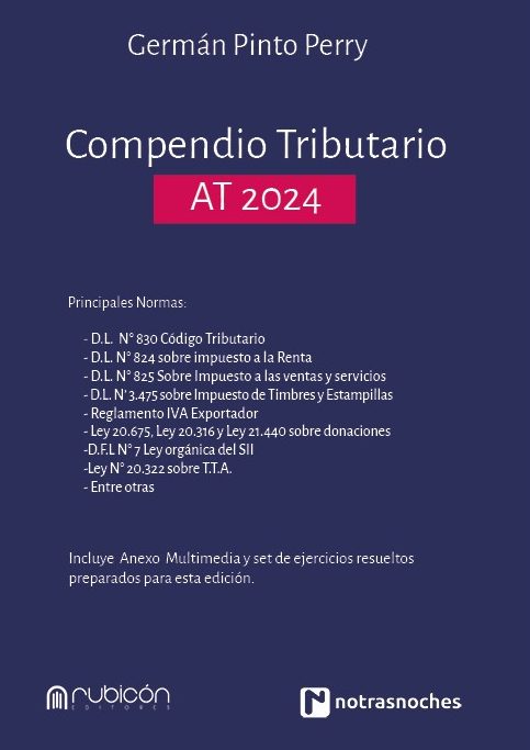 Este libro contiene una recopilación de las principales leyes tributarias necesarias para estudio de la especialidad, además de un importante apoyo para todos aquellos profesionales que se enfrentarán al exigente proceso de operación renta 2024. El Compendio Tributario 2024 quiere ser además un apoyo fundamental en la formación de quienes cursarán estudios de tributación, tanto a nivel de pregrado como de Magíster y diplomas, así como también servir de apoyo en el desarrollo de la profesión y sirviendo como un material de consulta permanente.