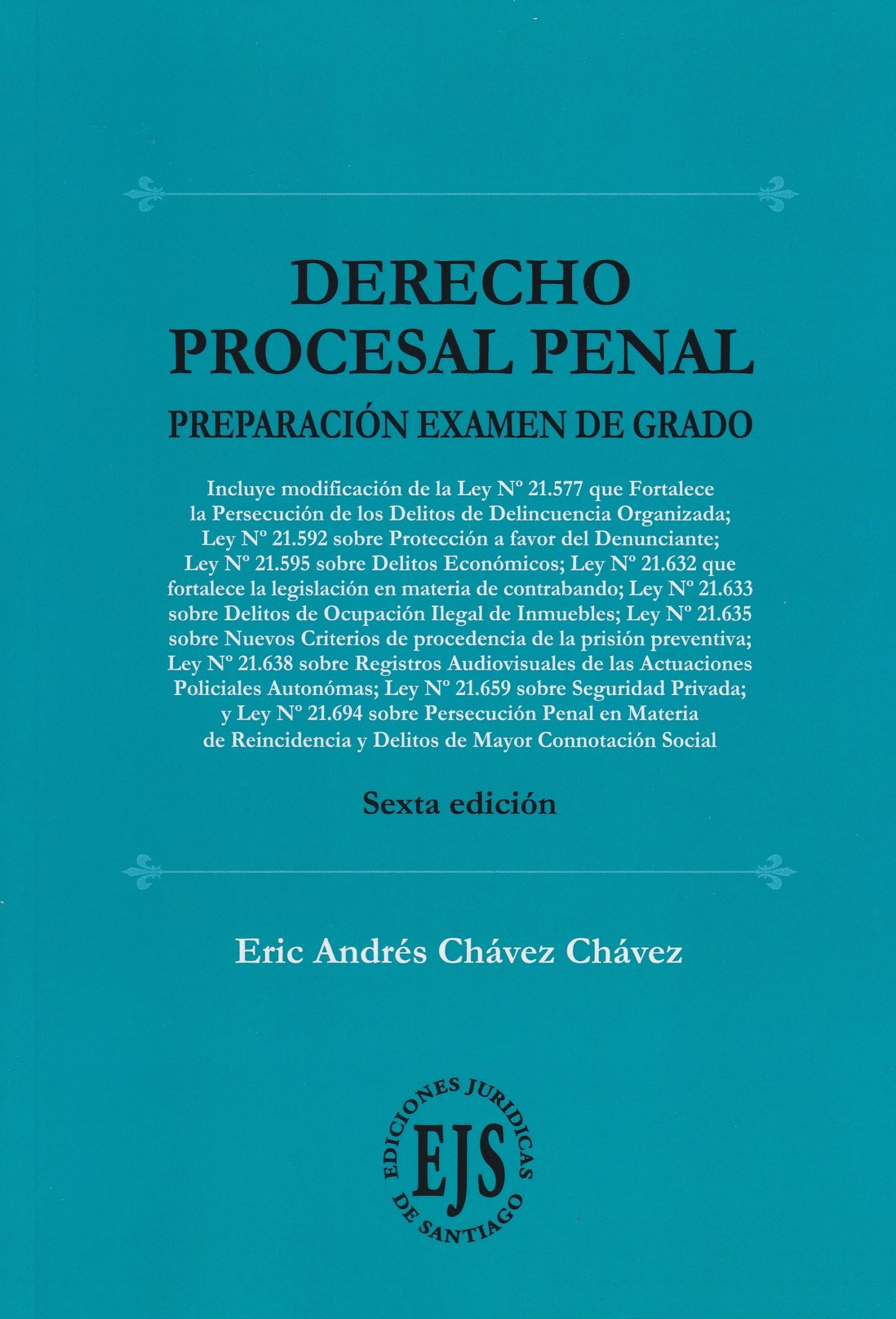 Derecho Procesal Penal. Preparación Examen de Grado, del abogado Eric Andrés Chávez Chávez, está destinada para repasar y actualizar por los Egresados de Derecho y alumnos de la carrera, la materia Procesal Penal, que ya fue internalizada en el pregrado y que ahora requiere coordinar en su mente.